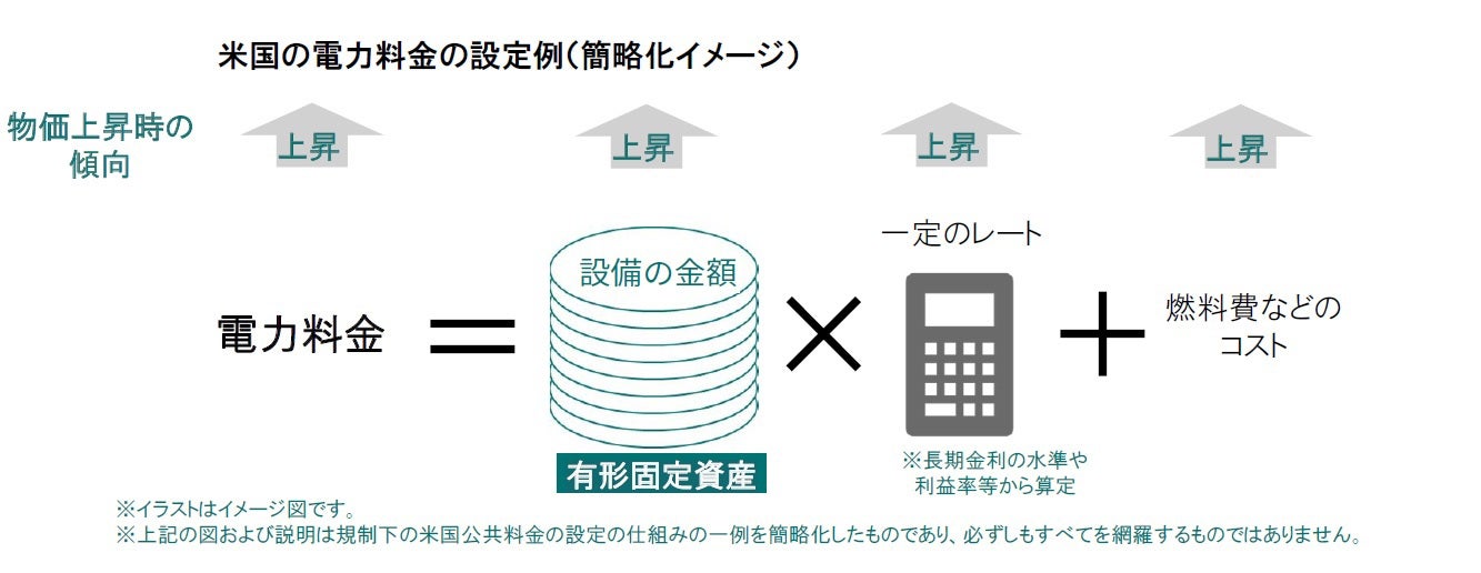 公益企業の収益のもととなる、公共料金の設定のしくみは国や地域によって異なりますが、米国の規制下の電力料金の決定の例を簡略化してみると、電力料金はその企業の持つ設備(有形固定資産)の金額に長期金利の水準や利益率等を勘案し算定、認可される一定のレートを掛け、それに燃料費などのコストを加えて決定されます。したがって、これらの要素は物価上昇時に公益企業の増収増益要因となる仕組みになっています。