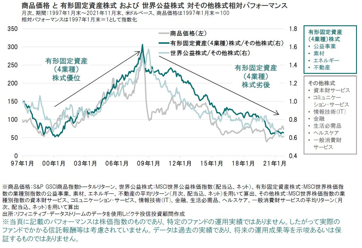 過去20年余りの実績でみると、商品価格や物価の上昇時には、土地、建物、工場、発電施設などの有形固定資産、いわゆる実物資産を多く所有する公益事業などの業種が、情報技術(IT)株式を含むそれ以外の業種の株式に対して、相対的にパフォーマンスが良い傾向が見られました。
