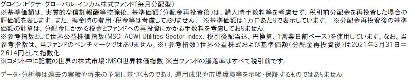 中長期的には世界的に電力などの需要拡大が予想されており、公益セクターの事業環境は良好との見方には変わりありません。当ファンドでは、公益企業のESG(環境、社会、ガバナンス)への取り組みを重視し、公益企業にエンゲージメント(対話)を行い、クリーンエネルギーシフトを目指しています。主要国・地域のクリーンエネルギー政策の強化の動きは、「グリーンシフト」を目指す公益企業の株式にプラスになるものと期待されます。