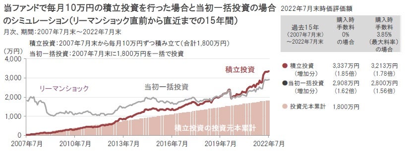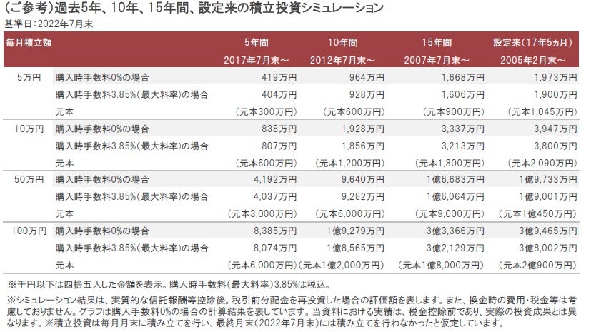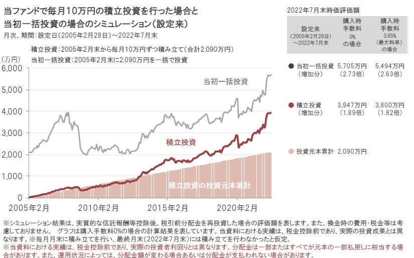 当ファンドを、設定日(2005年2月28日)から2022年7月末まで、毎月月末に10万円ずつ積立投資した場合、投資元本の評価額はおよそ2倍となりました。当初一括投資した場合は、元本は3倍近くに拡大しました。