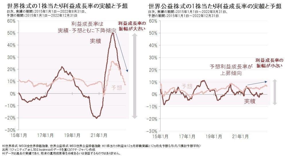 世界の企業全体では、業績が実績、予想ともに下振れ傾向にある中、公益企業の業績は底堅く推移しています。世界公益株式の利益成長率は振れ幅が小さく、足元は予想利益成長率が上昇傾向です。