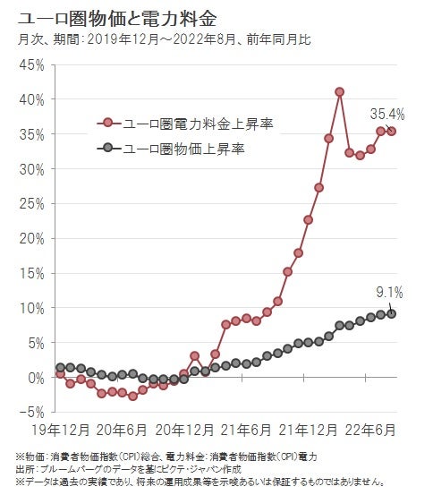 こうしたエネルギー価格の上昇は、一般消費者の電力料金をはじめとしたエネルギー料金に大きな上昇圧力をかけ、欧州の消費者の家計状況が悪化し、メディアは「生活費の危機」として大きく取り上げました。ユーロ圏の2022年8月の電力料金は前年同月比で+35.4%となっています。