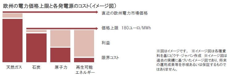 EU域内の再生可能エネルギー発電事業者にとって、1)上限価格は当初想定されていた価格を上回ったこと、2)超過利潤課税の導入等を巡る不確実性に対して利益予想が可視化されたことは好材料です。また、上限価格の180ユーロ/MWhは、2022年に入ってから付けた異常とも言える売電価格(およそ450~700ユーロ/MWh)を大きく下回るものの、再生可能エネルギーによる発電の限界コストを大幅に上回っており、引き続き高水準の利益を維持し続けることができるとピクテでは予想しています。