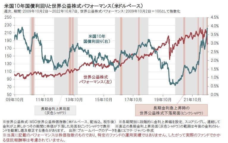 過去の実績では、長期金利が急上昇した際には、世界公益株式は下落する傾向がみられました。ただし、中長期的にみると金利上昇局面では世界公益株式は上昇しています。