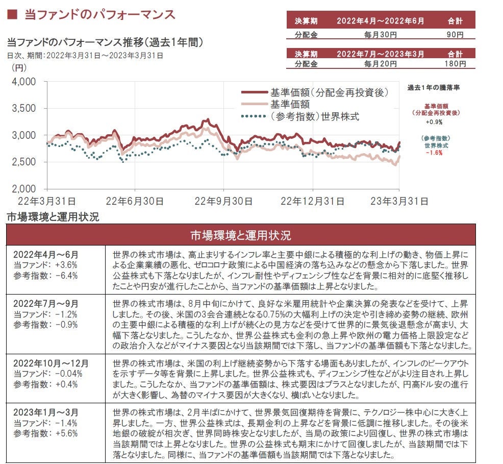●2023年1月~3月のピクテ・グローバル・インカム株式ファンド(毎月分配型)(以下当ファンド)の基準価額は世界株式がテクノロジー株中心に上昇するなか低調に推移し、下落となる