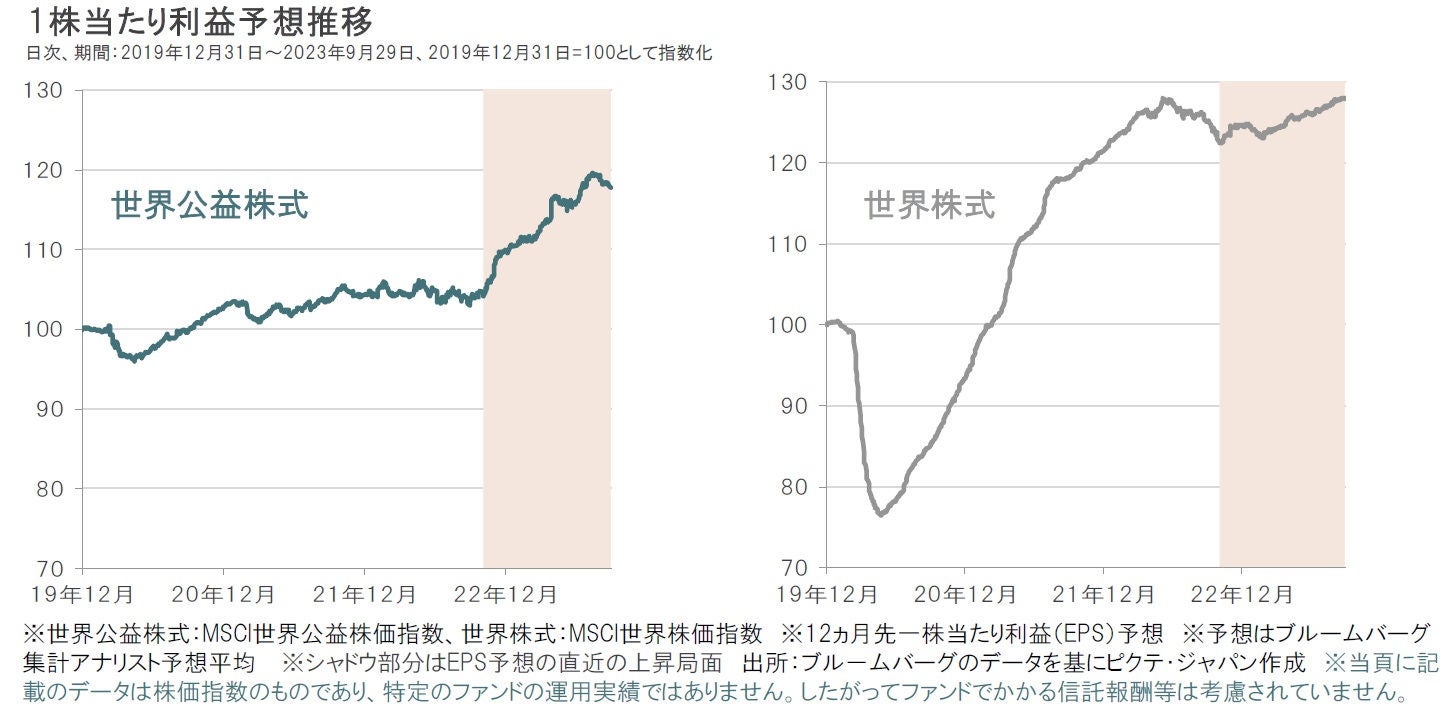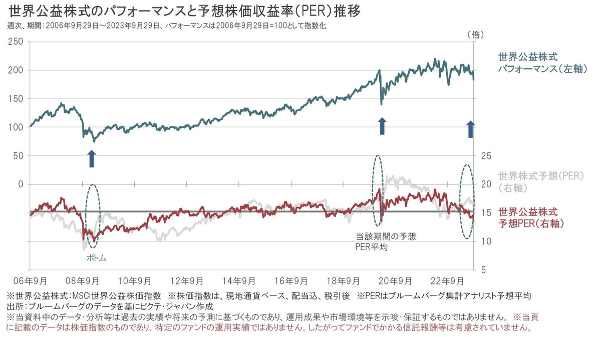 一方、バリュエーション(投資価値評価)は過去平均や世界株式平均と比べて相対的に低水準です。こうした投資環境は世界公益株式の中長期的な投資機会になるものとみています。