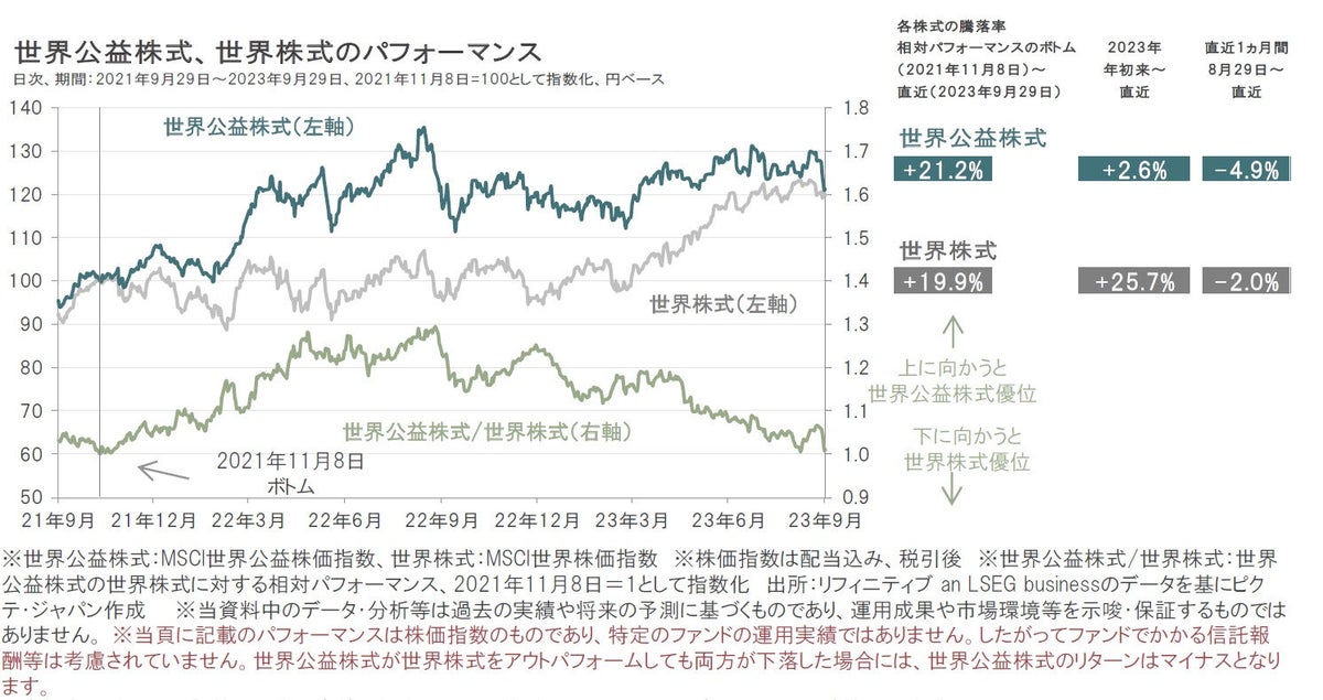 ●世界公益株式は足元、長期金利の急上昇を背景に相対的に軟調に推移
