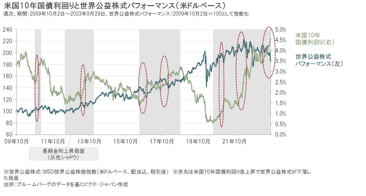■ 長期金利の急上昇局面では、世界公益株式の株価が調整する傾向