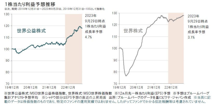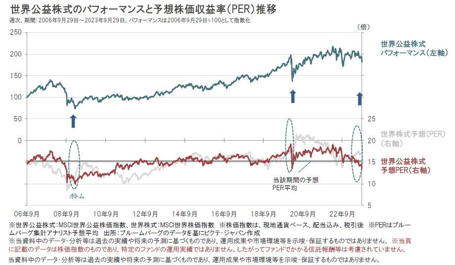 世界公益株式は株価の調整により、世界公益株式のPERは対過去平均、対世界株式でみて相対的に低い水準となっています。