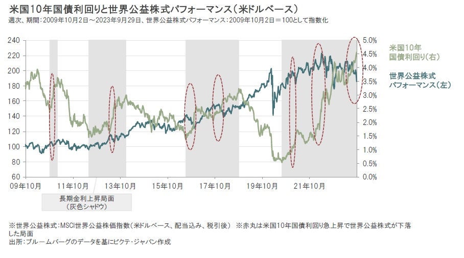 ■ 長期金利の急上昇局面では、世界公益株式の株価が調整する傾向