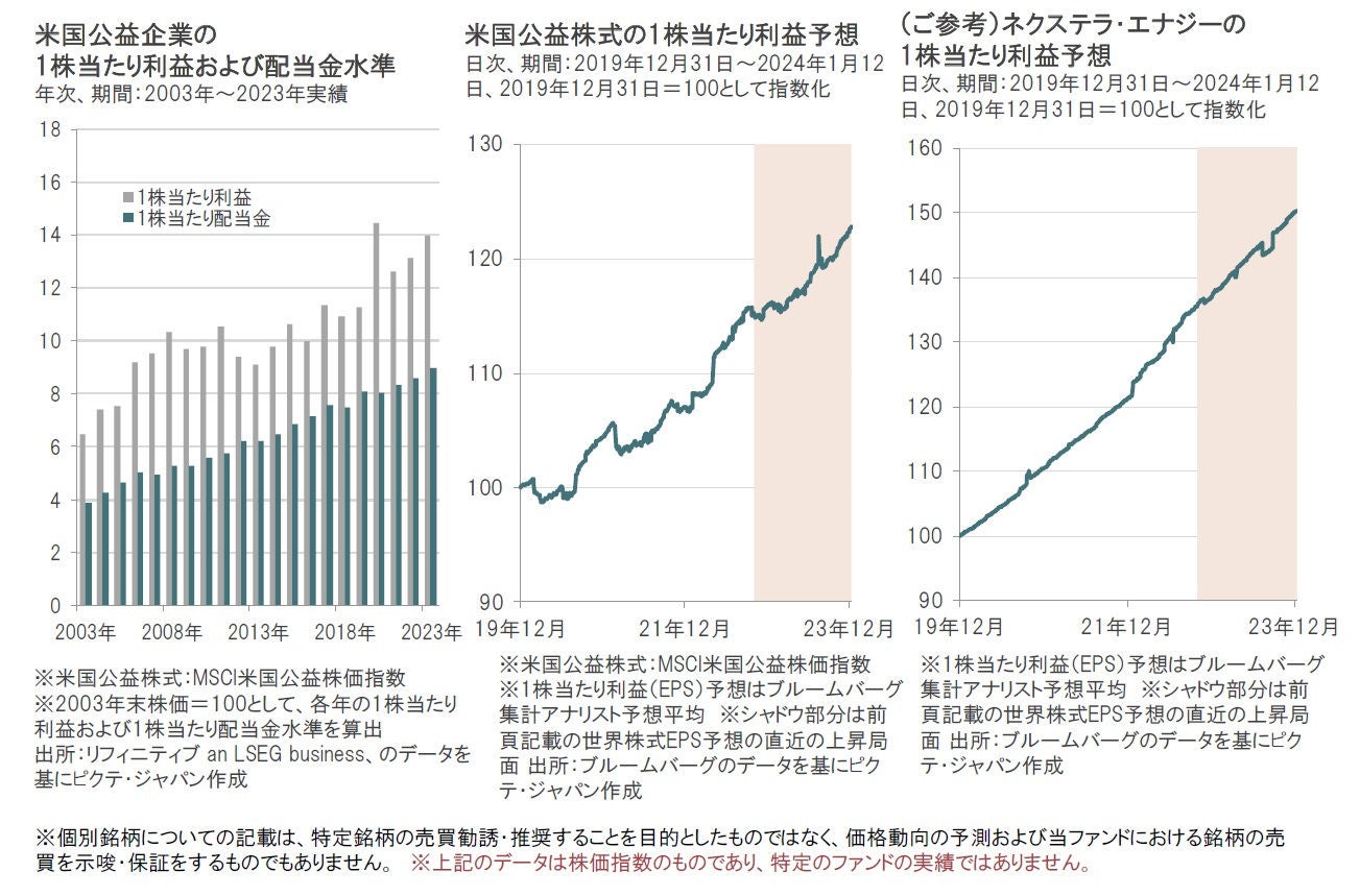 左下図は当ファンドの投資比率の高い米国の公益企業の1株当たり利益と配当金の推移です。右が同利益予想の推移を示しています