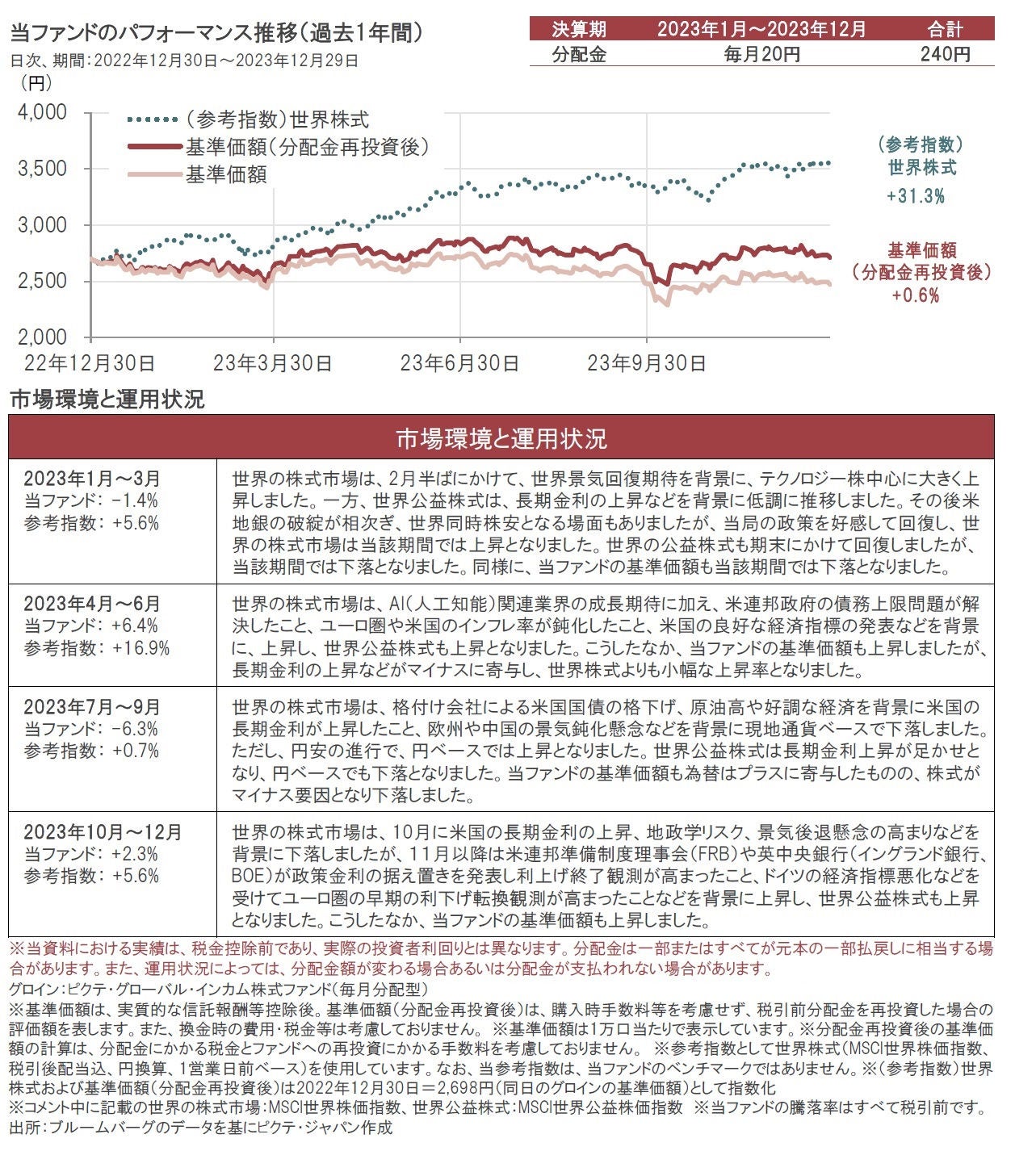 ●2023年10月~12月のピクテ・グローバル・インカム株式ファンド(毎月分配型)(以下当ファンド)の基準価額は、欧米のインフレ率が鈍化し、長期金利はピークアウトするなかで、政策金利引き下げ期待が高まっていることなどが背景となり、上昇。