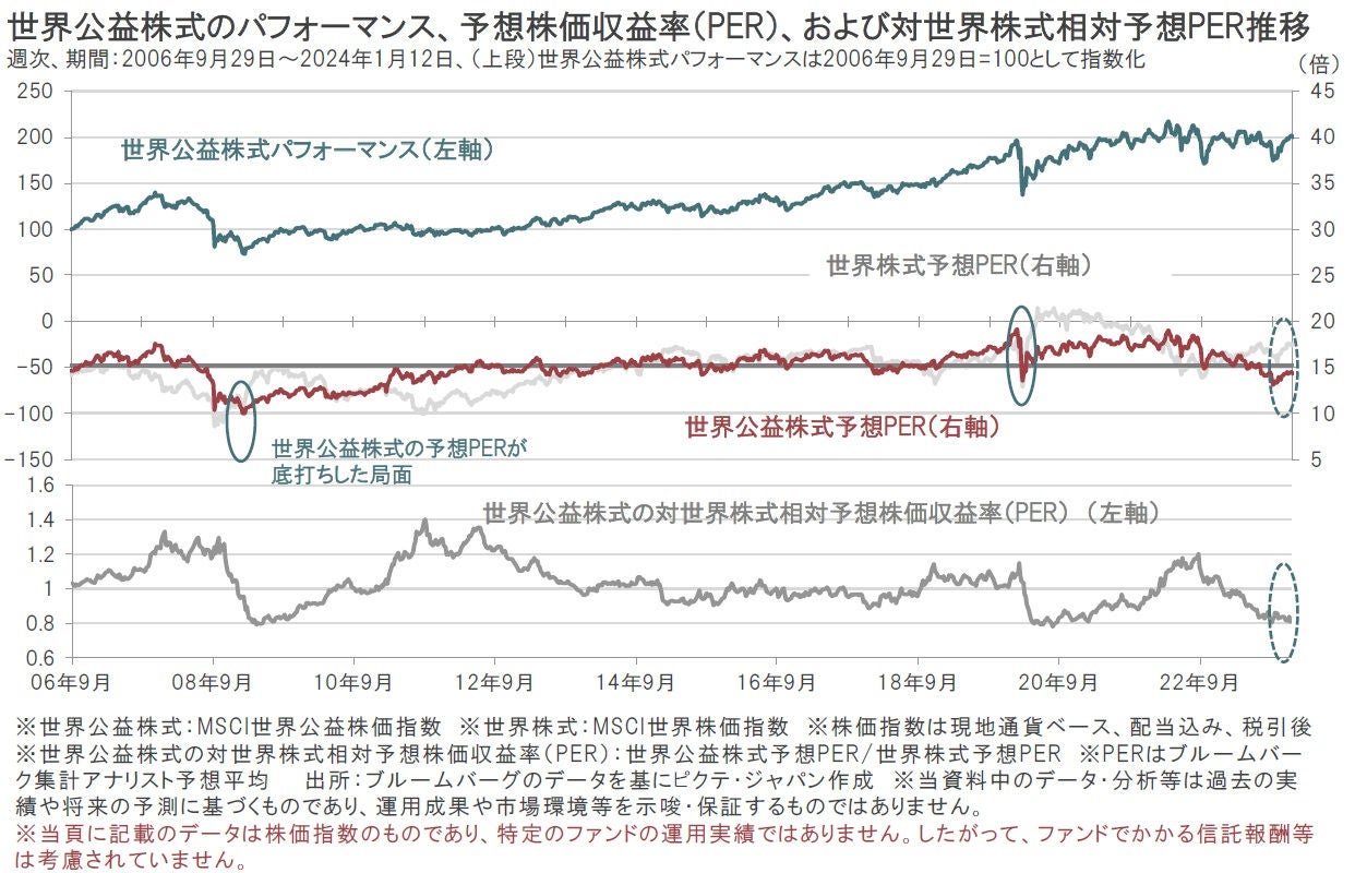 2022年夏には世界公益株の株価収益率(PER)は20倍弱でしたが、株価下落によりPERは大きく低下、その一方で世界株式は株価上昇とともにPERが上昇しています。世界公益株式の予想株価収益率(PER)は14.2倍と過去平均の15.2倍や世界株式17.6倍(2024年1月12日現在)と比べて低い水準にあり、世界公益株式は、相対的PERでみると割安感が高まっています。