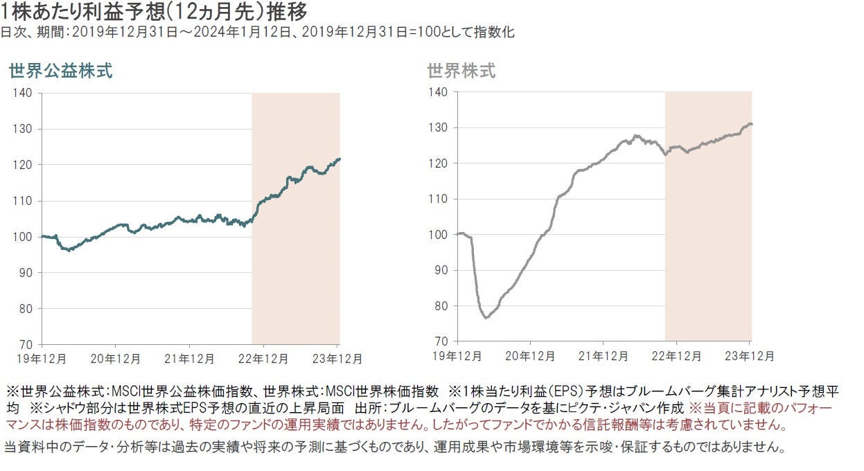 世界公益株式の1株当たり利益(EPS)予想は世界株式と比べても底堅く推移しています。