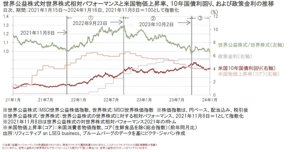 過去の2年近くの相対パフォーマンスをみると、①前半はインフレで世界公益株優位の時期が続きましたが、②過去1年近くでみると長期金利の急上昇などを背景にアンダーパフォームが続きました。その金利上昇が一服したことで、③直近相対パフォーマンスのボトムから2024年1月16日現在までで、世界公益株式は円換算ベースでも+11.6%と、世界株式の+9.0%を上回っています。