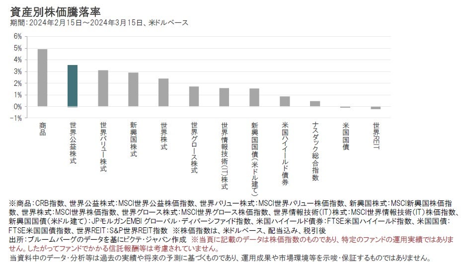 世界の公益株式は、足元1ヵ月間(2024年2月15日から3月15日)で、他の業界や資産に比べて上昇率が高くなり、世界株式を上回りました。この期間、上昇率が高かった資産は商品指数で、それに続いて世界公益株式、世界バリュー株式、新興国株式など、商品価格と連動する傾向がある資産となりました。特に、公益株式は、商品価格の変動が発電所などの資産価値や電力価格などと連動し収益に影響するため、商品価格の上昇が株価の上昇要因の一つとなっていると考えられます。