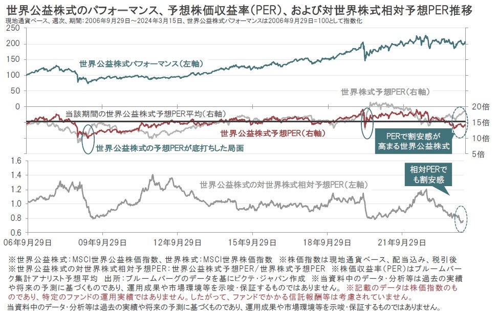 2024年3月15日時点の世界公益株式の予想株価収益率(PER)は14.2倍と、過去平均15.2倍や世界株式18.6倍と比べて低い水準にあり、世界公益株式は歴史的にも相対的にも割安感が高まっています。商品価格の動向やこうした割安感などから世界公益株式投資の魅力が高まっているものと考えられます。現在は中長期的な投資の投資機会と考えられます。