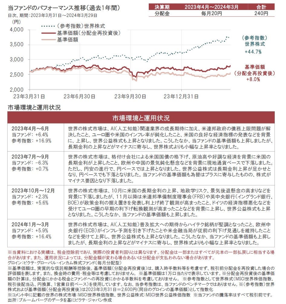 ● 2024年1月~3月のピクテ・グローバル・インカム株式ファンド(毎月分配型) (以下、当ファンド)の基準価額は、欧米をはじめとした多くの国でインフレ率が鈍化するなか、政策金利引き下げ期待が高まっていることなどを背景に、上昇。