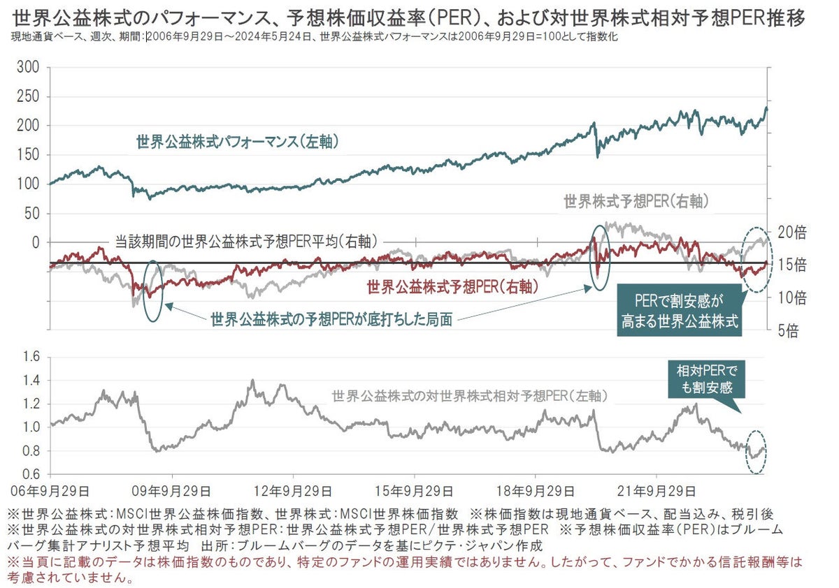 2024年5月24日時点の世界公益株式の予想株価収益率(PER)は15.1倍と世界株式の18.6倍と比べて低い水準にあり、過去との比較においても、世界公益株式は相対的に割安感が高まっています。