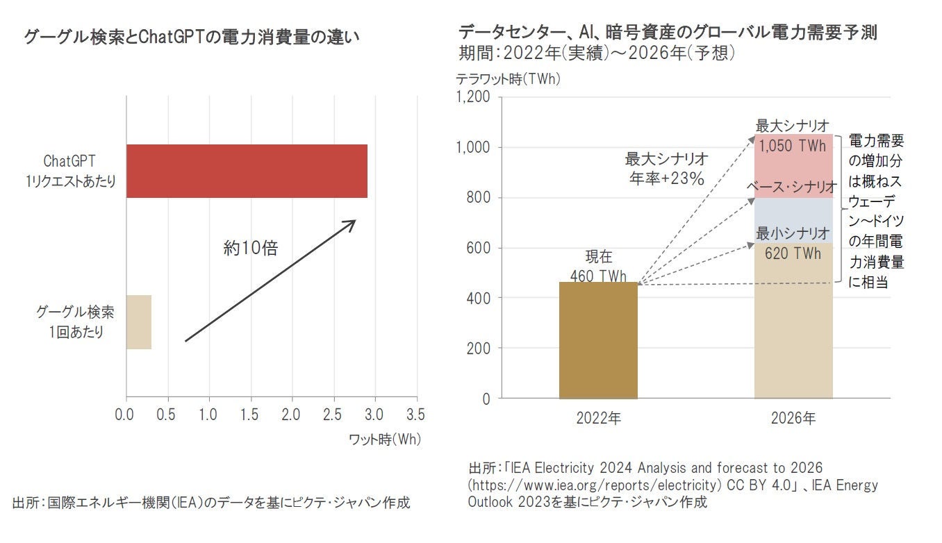 国際エネルギー機関(IEA)によると、2022年から2026年にかけて世界のデータセンターやAI、暗号資産の電力需要は年平均最大で23%増加し、460TWhから2026年には620TWh~1,050TWhへ拡大する見込みです。増加分は最小でスウェーデン、最大でドイツ1国あたりの年間電力消費量に相当します。