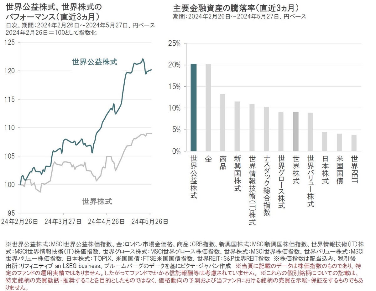 ■ 世界公益株式は5月に年初来高値を更新し、直近では主要株式を上回って推移