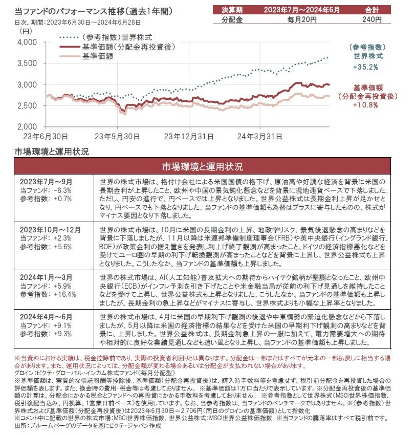 ● 2024年4月~6月のピクテ・グローバル・インカム株式ファンド(毎月分配型)(以下、当ファンド)の基準価額は、長期金利急上昇の一服に加えて、AI(人工知能)の普及に伴う電力需要増大への期待や相対的に良好な業績見通しなどを背景に、上昇。