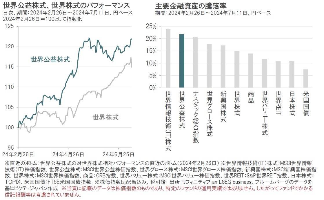世界公益株式は、2024年5月に年初来高値をつけ、直近の対世界株式の相対パフォーマンスのボトムから足元(2024年2月26日~7月11日)にかけては、主要金融資産を上回って上昇しています。これまで足枷となっていた長期金利の急上昇が一服したことや、膨大なデータを処理する生成AI(人工知能)の利用が広がり、電力消費の多いデータセンターの建設が相次いでおり、関連する公益銘柄に注目が集まったことなどが、株価の押し上げ要因になったと考えられます。