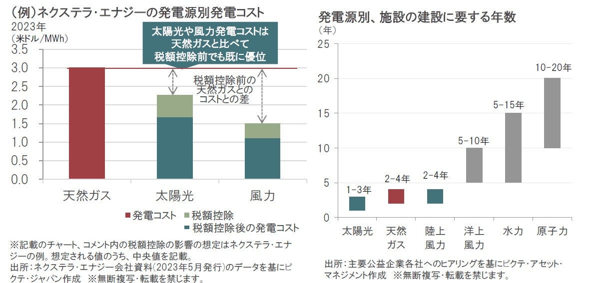 当ファンドが注目している米国の太陽光や風力の発電コストは、火力発電などよりも低下していることに加えて、太陽光や陸上風力発電の施設の建設に必要な年数は、平均で1-4年と、水力や原子力などの場合と比べて短く、急速な電力需要の拡大に対応し易いことなどが、グリーンシフトが加速する大きな要因となっています。