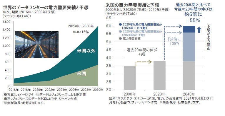 データセンターの電力需要増や電気自動車、IoTの普及など、経済の電化の加速を背景に、米国の電力需要の伸びは、過去20年間の+9%から今後20年間は+55%と、約6倍になると予想(2024年11月予想)されています。この予想は、電力需要の急拡大を背景に5ヵ月前の予想から大きく上方修正されました。