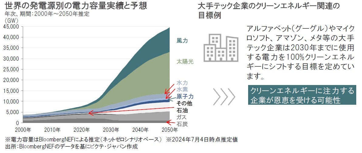 世界的にネットゼロ(脱炭素化)を推進する政策や環境意識の高まりが広がる中、AI・データセンター関連の電力需要増加や電化の進展、そしてクリーンエネルギーの発電コスト低下や建設にかかる期間の短さなどを背景に、クリーンエネルギー発電施設の設備投資拡大が予想されています。加えて、大手テック企業中心に2030年までにクリーンエネルギーへ100%シフトする目標を掲げる動きなどもあり、クリーンエネルギーを中心に設備投資が拡大すると予想されます。