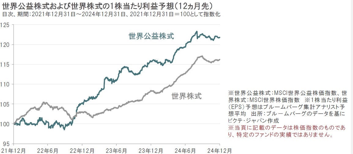 また、世界公益株式のバリュエーション(投資価値評価)は、高い利益成長見通しにもかかわらず、現在、魅力的な水準であることから、中長期的な投資機会を提供するとみています。