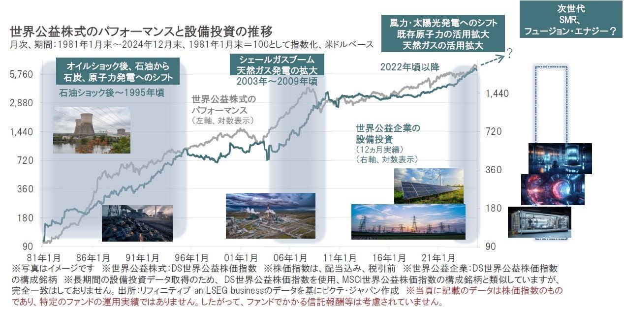 過去の実績では、世界公益株式のパフォーマンスは設備投資と連動性が高くなっています。公益事業では多くの場合、設備投資の拡大は、発電容量や電力料金収入の増加要因になることから、株価の上昇につながり易くなると考えられます。公益事業の設備投資拡大のトレンドは十数年おきに到来しています。