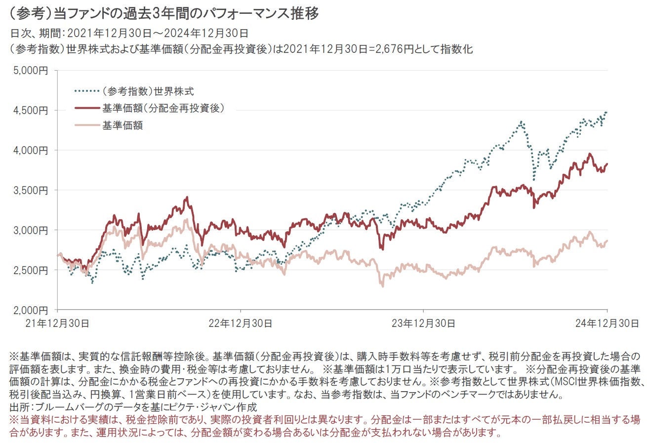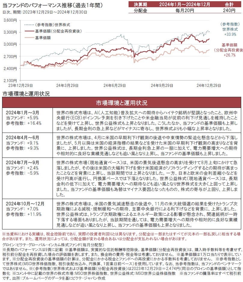 ● 2024年10月~12月のピクテ・グローバル・インカム株式ファンド(毎月分配型)(以下、当ファンド)の基準価額は、AI(人工知能)の普及に伴う電力需要増大への期待や相対的に良好な業績見通しなどを背景に、上昇。