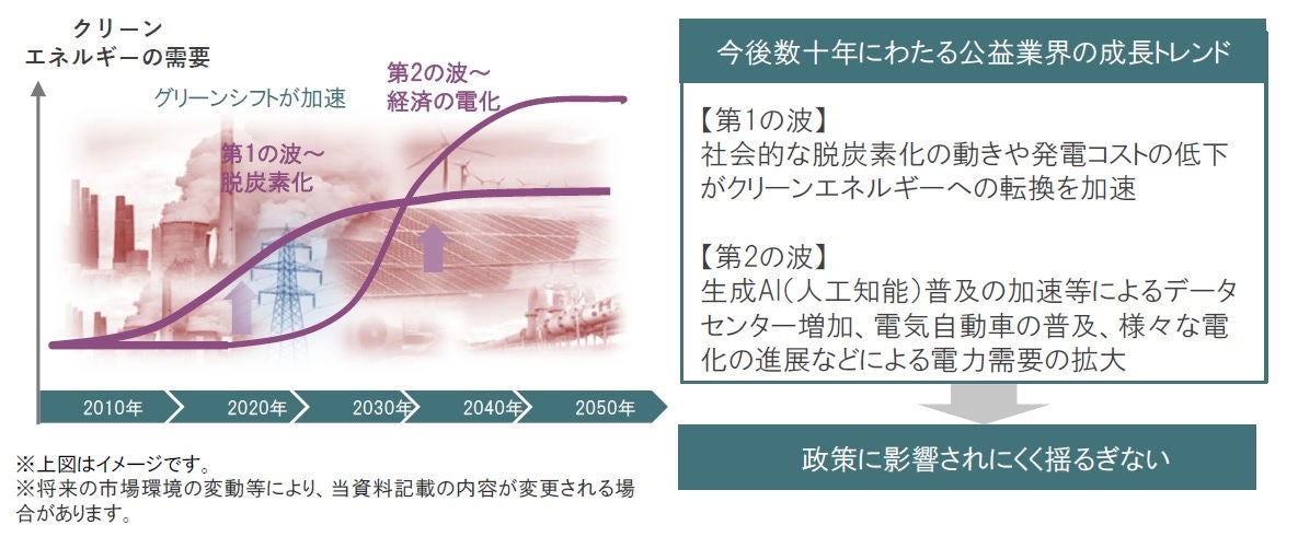 世界の公益業界は、長期的に続く大きな「2つの波」による電力需要の拡大を背景に、今後数十年にわたり、成長トレンドが継続すると予想しています。