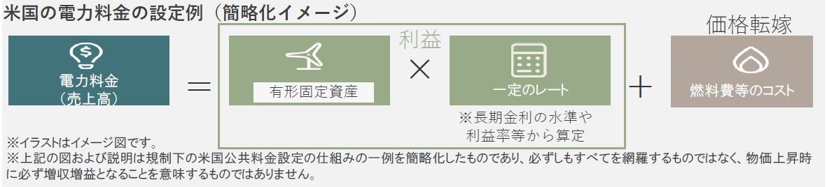 米トランプ政権のエネルギー政策による公益企業への影響に関しては、米国規制下の公益事業は、一定の利益を確保したうえで、税金や燃料費、資金調達コストなどの増加を料金に転嫁できる仕組みを有していることから、政策如何による利益への中長期的なマイナスの影響は少ないとみています。