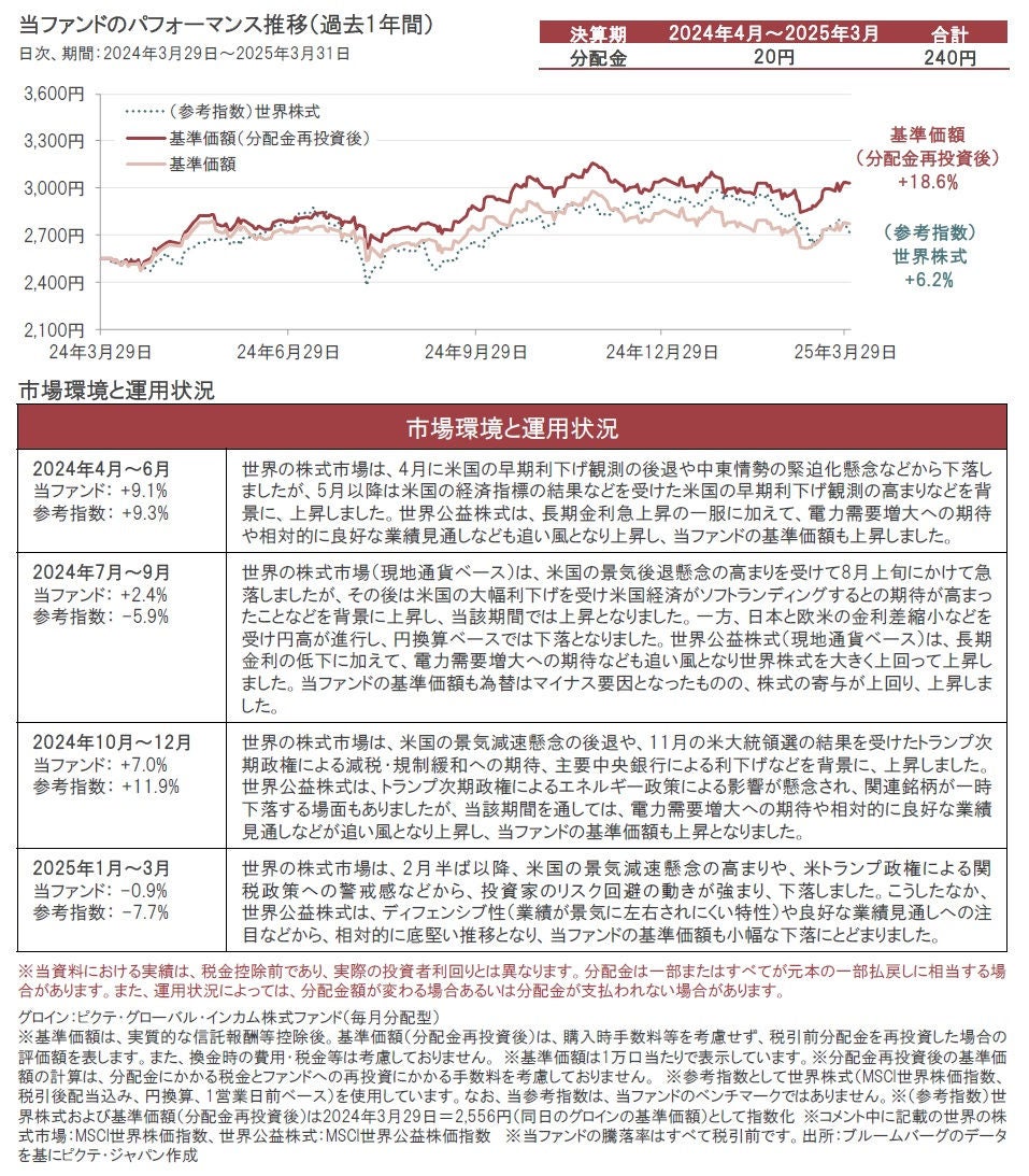 ● 2025年1月~3月のピクテ・グローバル・インカム株式ファンド(毎月分配型)(以下、当ファンド)の基準価額は、米国の景気減速や関税政策などへの懸念から市場が調整するなか、公益株式のディフェンシブ性や良好な業績見通しなどが注目され、相対的に底堅く推移