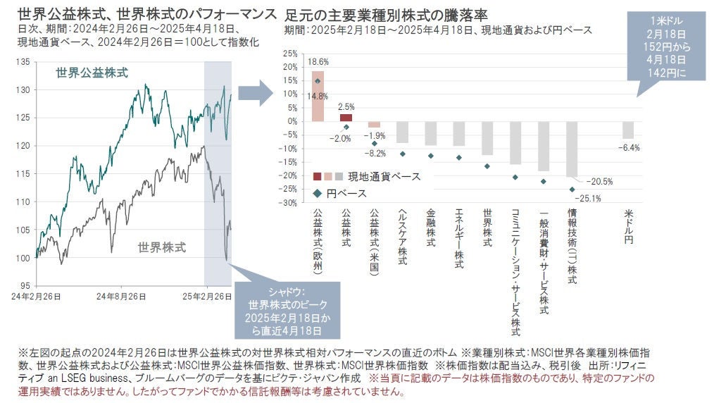 市場の先行き不透明感が高まるなかで、公益企業は、1)業績が景気に左右されにくく、2)関税の影響を直接受けにくい非製造業でかつ、関税引上げで予想される物価上昇に強いこと、3)株価は相対的に割安な水準となっていることなどから、株式市場の調整は公益株式の中長期的な投資機会を提供すると考えます。
