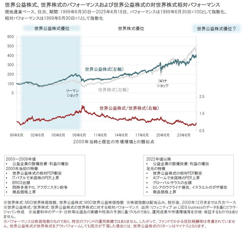過去の実績では、2000年から2008年にかけて、世界公益株式のパフォーマンスは世界株式に対して優位となりました。その後、2009年以降は世界株式が優位となりました。足元では、世界公益株式が優位に転換した2000年当時の市場環境との類似点がいくつかみられることから、再び世界公益株式が優位となり、中長期的な投資機会となる可能性もあるとみられます。