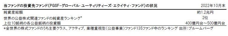 当ファンドの投資先ファンドであるPGSF-グローバル・ユーティリティーズ・エクイティ・ファンドの純資産総額は2022年10月末で約1.2兆円と世界の公益株式関連ファンドの純資産ランキング*で2位の規模となっています。また、各公益銘柄への投資額は上位10銘柄では、400億円台~500億円台となっており、各企業の上位株主となっています。この規模は、弊社のエンゲージメントが効果を上げる可能性が相対的に大きいことを示しています。