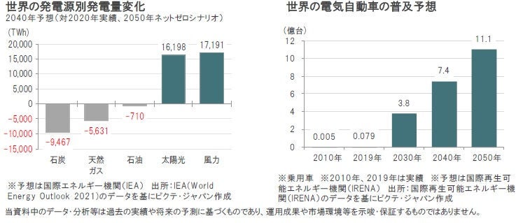 こうした環境下、化石燃料による発電から、太陽光や風力などのクリーンエネルギーへの移行「グリーンシフト」が加速すると予想されています。また、主要各国でのガソリン車新車販売廃止の目標設定など様々な政策に後押しされ、世界の電気自動車の普及をはじめとした「電化の進展」が加速すると予想されています。この2つは環境に貢献するだけでなく、前者はグリーンシフトを行う企業の利益増に、後者は電力需要が増加する要因となり、公益企業の成長ドライバーになるものと期待されます。