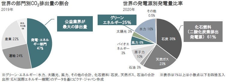 地球温暖化による気候変動の脅威を背景に、その要因となる二酸化炭素を削減しようという世界的な取組みが行われていますが、世界の部門別二酸化炭素(CO2)排出量の割合では、公益業界が多くの割合を占める発電エネルギー部門がおよそ5割と最大です。また、世界の発電に占める、CO2を排出する石炭、天然ガス、石油などの化石燃料による発電の割合は全体の約6割を占めています。加えて、ロシア・ウクライナ紛争など地政学リスクによるエネルギー安全保障問題を解決するためにも、発電源を変える必要があり、状況は変わりつつあります。