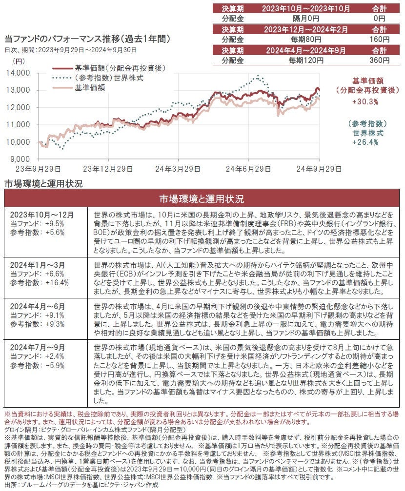 ● 2024年7月~9月のピクテ・グローバル・インカム株式ファンド(隔月分配型)(以下、当ファンド)の基準価額は、長期金利の低下に加えて、AI(人工知能)の普及に伴う電力需要増大への期待や相対的に良好な業績見通しなどを背景に、上昇。