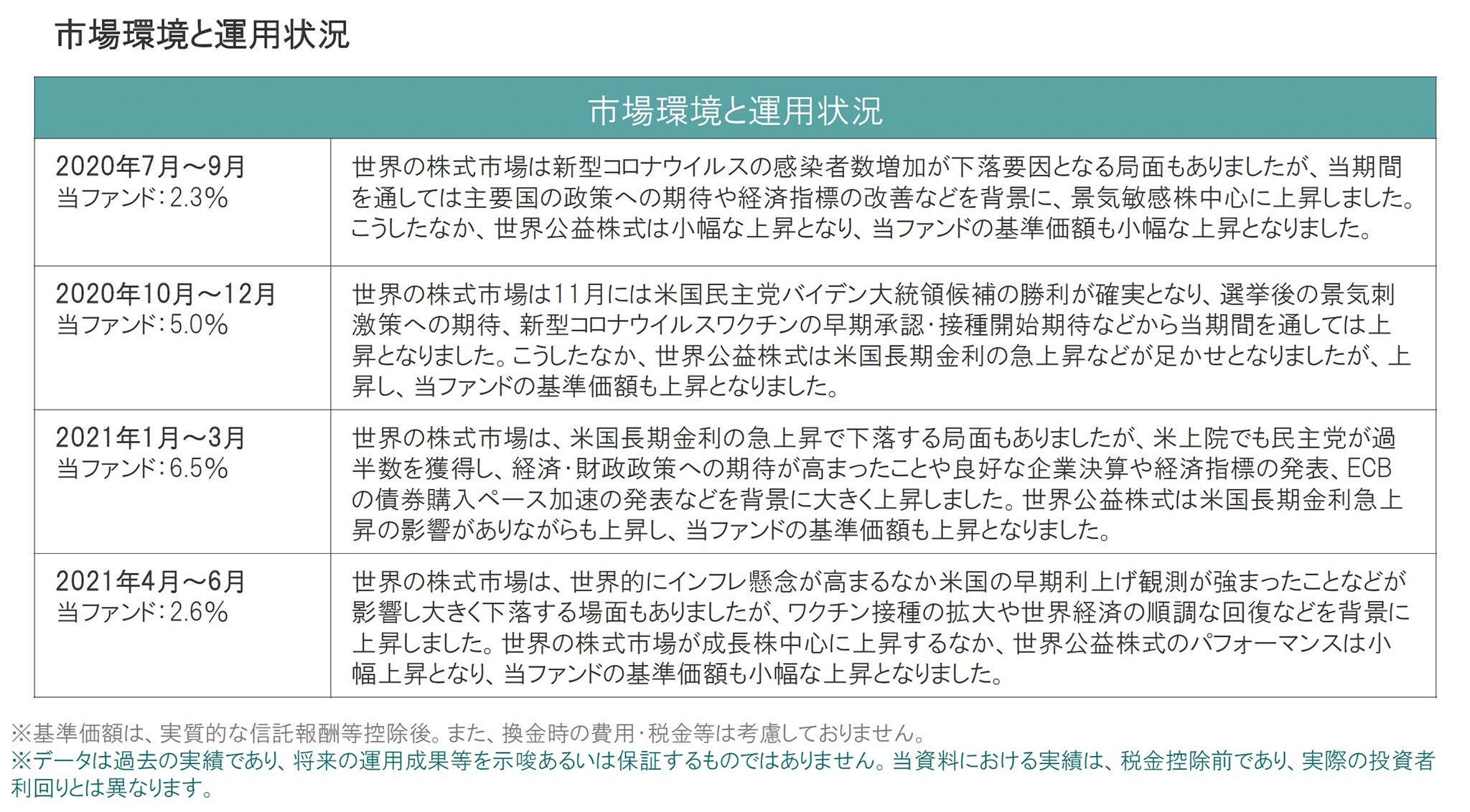 2021年4月~6月にかけては、世界の株式市場は、ワクチン接種の拡大や世界経済の順調な回復などを背景に成長株中心に上昇するなか、世界公益株式のパフォーマンスは小幅上昇となり、当ファンドの基準価額も小幅な上昇となりました。世界景気回復期待と共に物価が上昇傾向にあり、利上げが視野に入ってきています。1998年以降でこのような局面では世界公益株式は株式市場全体とともに上昇する傾向が見られました。