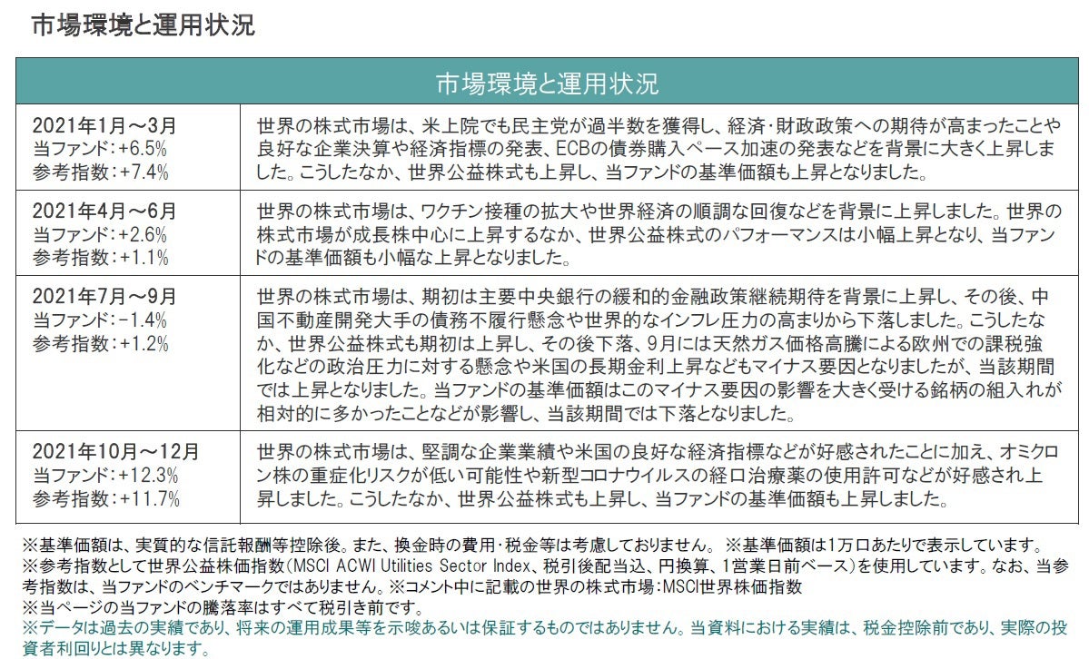 2021年10月~12月(過去3ヵ月)でパフォーマンスにプラス寄与度の大きかった主な銘柄はナショナル・グリッド、ネクステラ・エナジー、RWE(ドイツ、総合公益事業)などでした。ナショナル・グリッドは好決算の発表に加え、物価に連動して認可される電力料金体系による増益期待などを背景に上昇しました。ネクステラ・エナジーは、電力料金値上げの承認や米国のクリーンエネルギー関連政策への期待などを背景に上昇しました。RWEはドイツの新連立政権がエネルギー政策で再生可能エネルギーによる発電の増強などの積極的なガイドラインを発表したことなどがプラスとなりました。