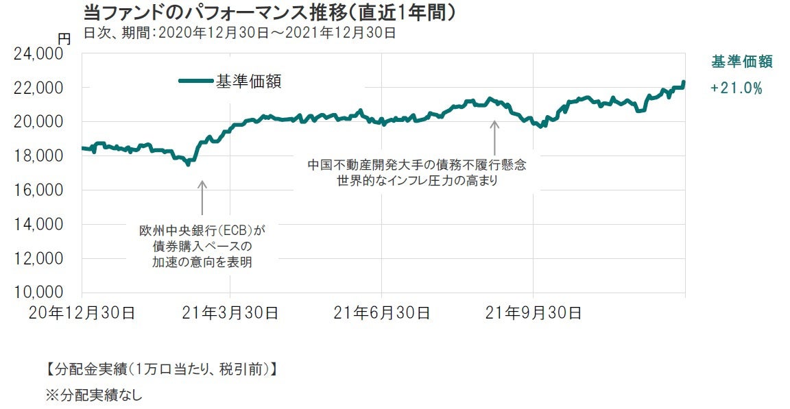 2021年10月~12月のピクテ・グローバル・インカム株式ファンド(1年決算型)(グロイン1年、以下当ファンド)の基準価額は上昇となりました。新型コロナウイルス感染症の経口治療薬の使用が許可されたこと、米国の良好な経済指標の発表などが好感され世界の株式市場全体が上昇したことなどが寄与しました。市場動向に注視が必要ですが、引き続き「グリーンシフト」を目指す公益企業は中長期的な成長が期待できると考えます。