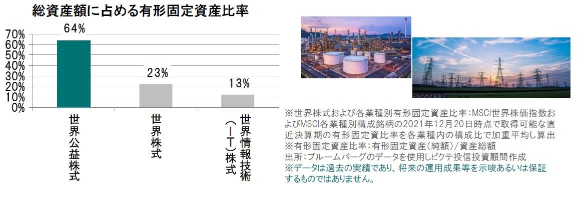こうしたなか、世界公益株式は底堅く推移し、2021年11月頃から世界株式のパフォーマンスを上回って推移しています。この背景には、物価が高騰するなかで、1)実物資産を多く所有する公益企業の企業価値が高まっていること、2)業績が物価上昇や景気変動の影響を受けにくい特性が注目されたことなどがあげられます。
