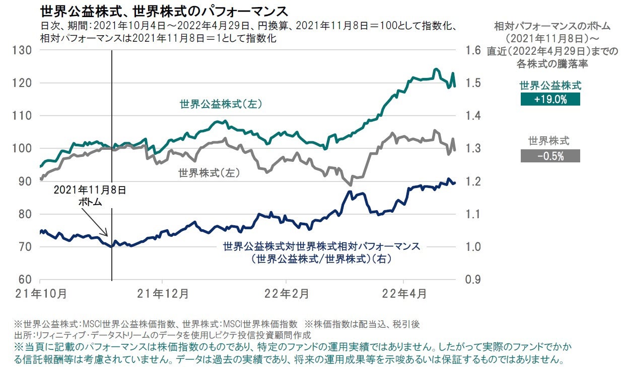 ●世界公益株式は2021年11月頃から世界株式をアウトパフォーム