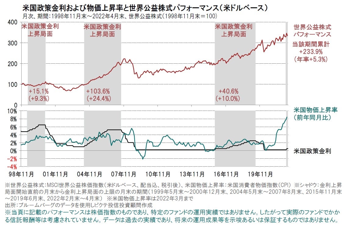 コロナショック後の経済の正常化とともに、米国では物価が上昇し、3月には政策金利が引き上げられました。過去において、世界公益株式は金利が急上昇する局面では一時的に調整しましたが、米国政策金利が据え置きあるいは引き上げられている局面を通してみると、物価が上昇するなか、株式市場全体とともに上昇しました。