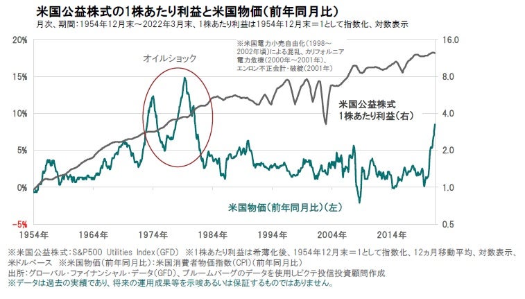景気後退局面で物価が高騰するスタグフレーションが起こった1970年代のオイルショック時では、米国公益企業の利益は比較的安定していました。足元でも安定して推移しています。
