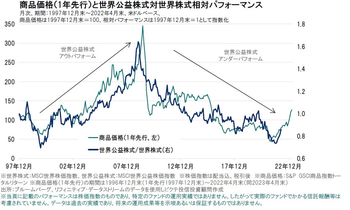 世界公益株式対世界株式相対パフォーマンスは、世界公益株式が世界の株式の平均的な動きに対してパフォーマンスが良かったのか、悪かったのかをみたものです。商品価格が上昇していた時期には、世界公益株式はより優れたパフォーマンス(アウトパフォーム)となる傾向がある一方で、商品価格が下落していた時期には、パフォーマンスが劣る(アンダーパフォーム)といった傾向が見られました。